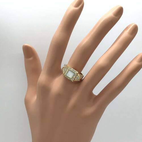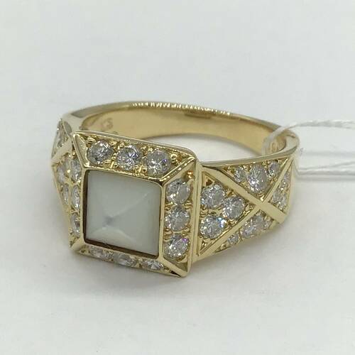 中心にシェルのピラミッドのようなデザインが施され、回りにはダイヤモンドが敷き詰められた、おしゃれなリングです。