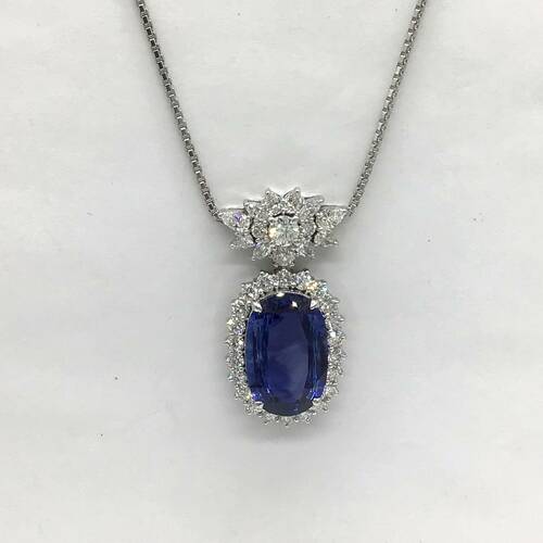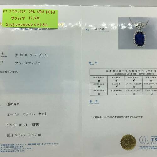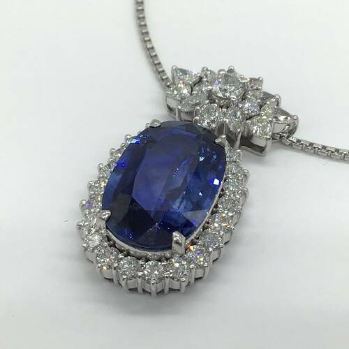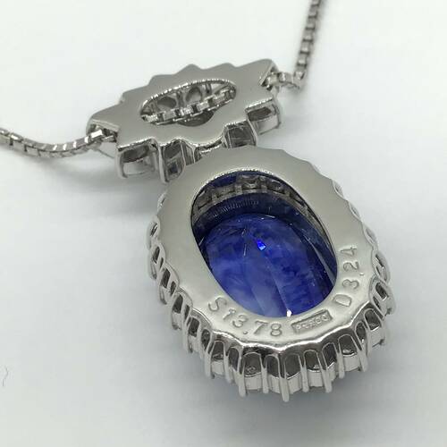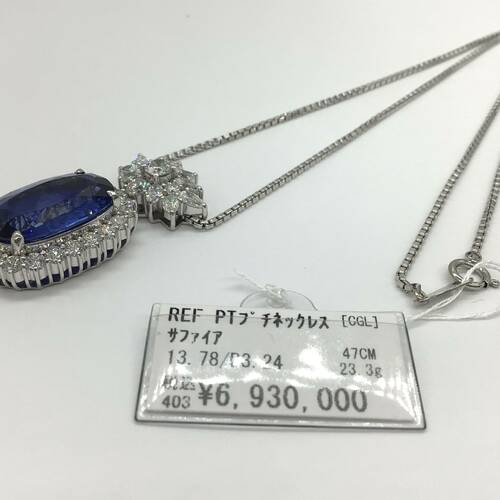 | コメント | 9月誕生石のサファイアは13.78キャラットと、とても大きくバチカンとサファイアの回りのダイヤモンドは総キャラット3.24キャラットの輝きが、とても美しく存在感のあるネックレスです。鑑別書付き。 |