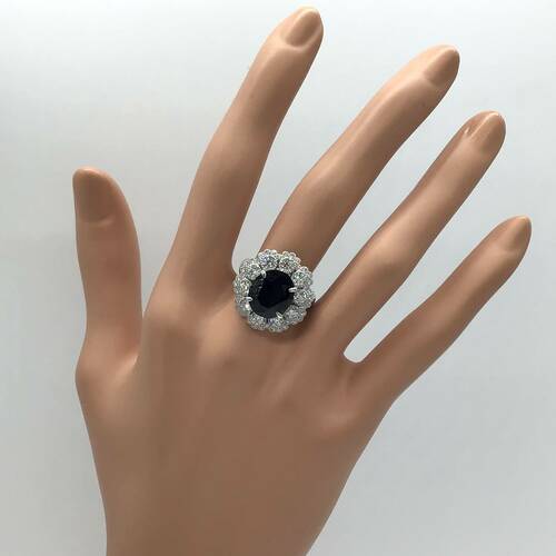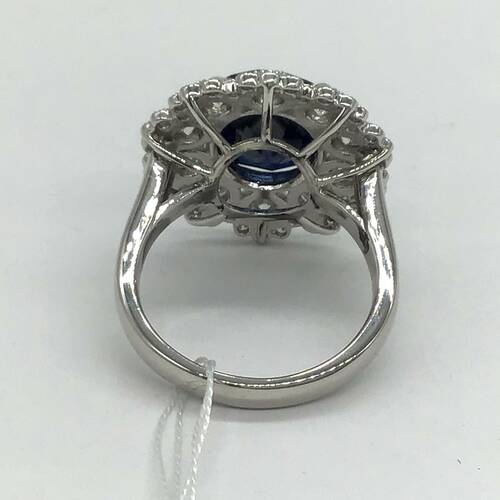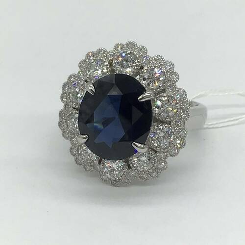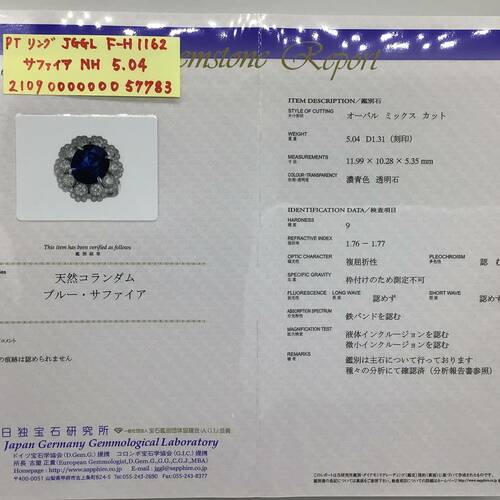 9月誕生石のサファイアの中でも非加熱のサファイアなので希少価値がある1点です。5.04キャラットの大きさと深海のような濃い青色、1.31キャラットのダイヤモンドの輝きは圧巻です。鑑別書付き。