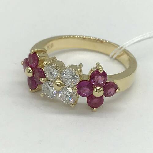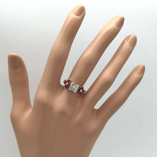 中心にダイヤモンド、サイドにルビーが1.05キャラット施された、3輪の花のモチーフが可愛らしいリングです。