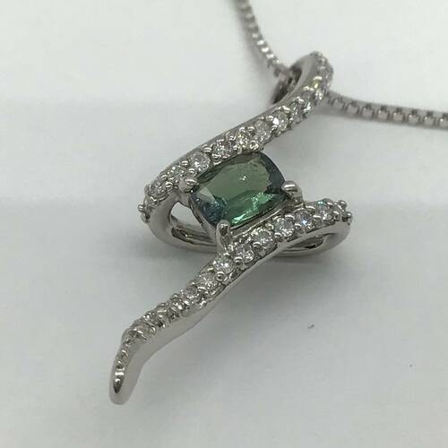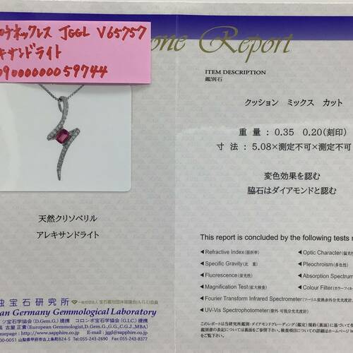 | コメント | 6月誕生石のアレキサンドライト陽の光の下では深いフォレストグリーン、そして夜白熱灯の下では艶めいた輝きを放つバーガンディに劇的に変化します。スライドアジャスターにより長さ調整が可能。鑑別書付き。 |