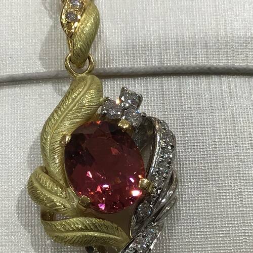 | コメント | トルマリンが2,32ct 重みのあるペンダントネックスです。 18金とプラチナのコンビです。 トップの部分は金の艶消しとチャームポイントです。 |