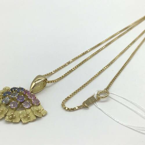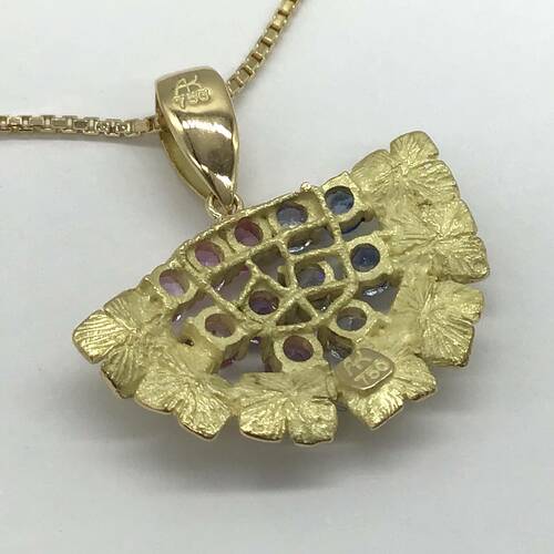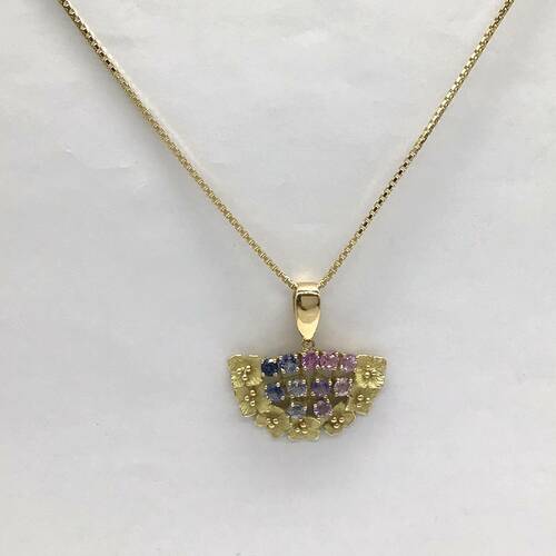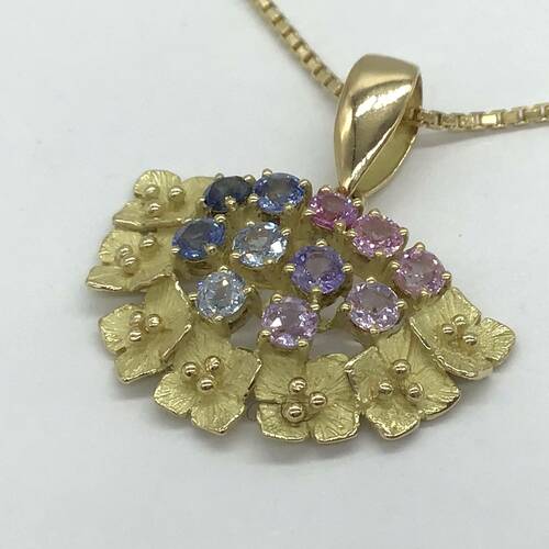 | コメント | 9月誕生石のサファイアはカラーバリエーションが豊富です。ピンク〜ブルーへのグラデーションが可愛らしく、扇型のデザインがおしゃれなネックレスです。 |