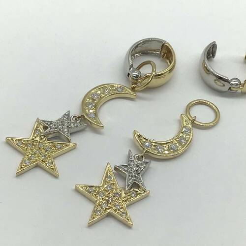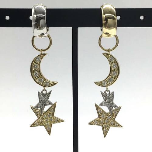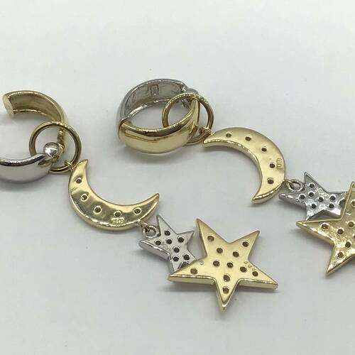 | コメント | ゴールドの月とゴールドとプラチナ2つの星がモチーフのイヤリングです。揺れるイヤリングは女性らしい人気のタイプです。 |