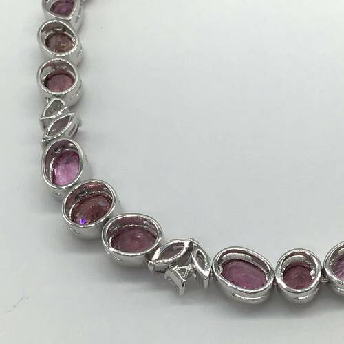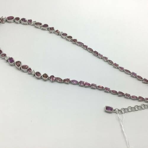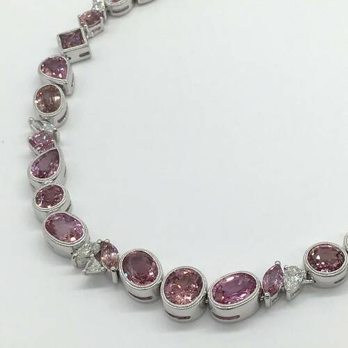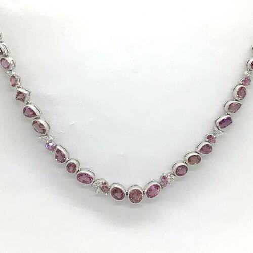 | コメント | 9月誕生石のサファイアはカラーバリエーションが豊富です。その中でもピンクサファイアは上品でロマンチックな気分にさせてくれる「天空の宝石」と言われています。全体に29.70キャラットのサファイアが施された、とても豪華なネックレスです。別売でペアのピアスもあります。鑑別書付き。 |