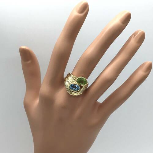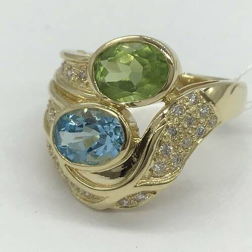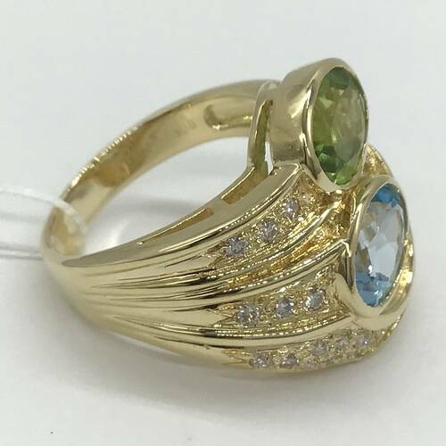 | コメント | 爽やかで優しい輝きが魅力の8月誕生石のペリドットと、海や空のように澄み切った青色の11月誕生石のブルートパーズがおしゃれで豪華なリングです。 |