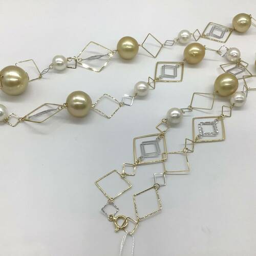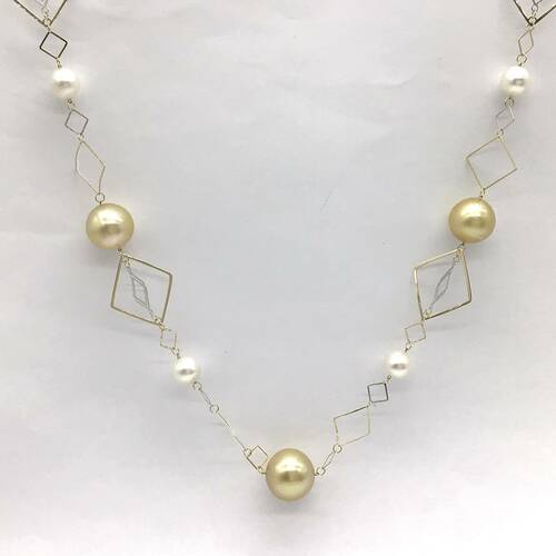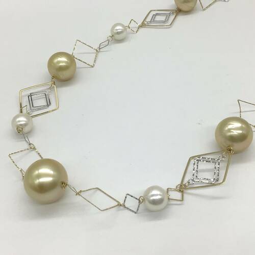 | コメント | 6月誕生石のパールの黄味かかった大粒が7石、白〜ピンクかかったのが8石、繊細なデザインのチェーンがおしゃれなロングネックレスです。 |