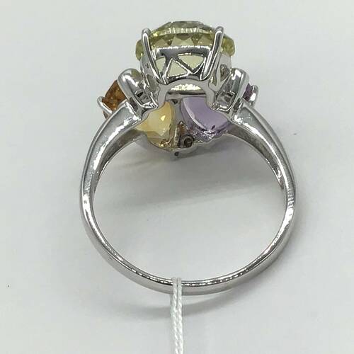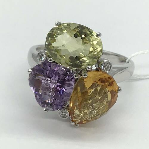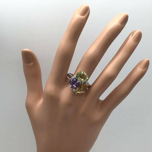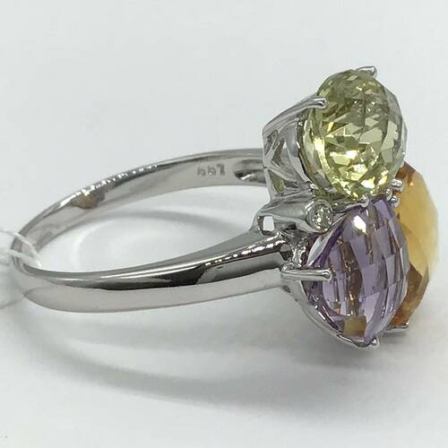 | コメント | アメジスト、シトリン、薄い黄色のクォーツなど、色とりどりの宝石が目を引くおしゃれなリングです。 |
