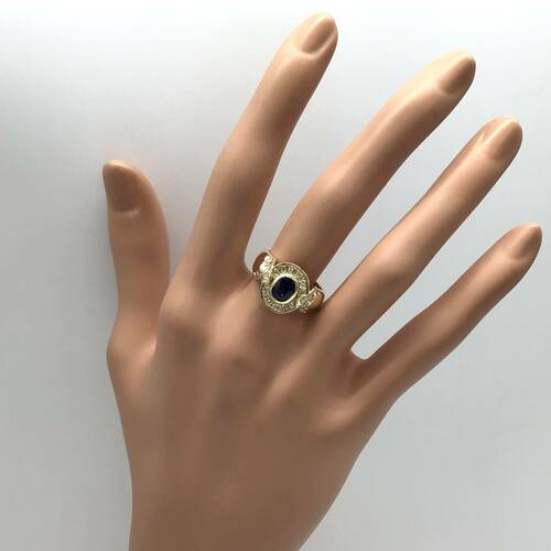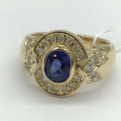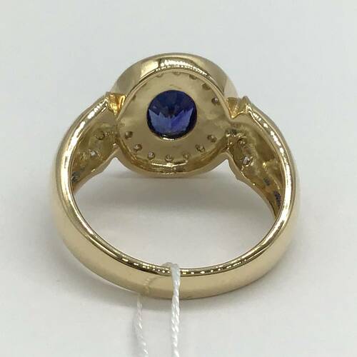 9月誕生石のサファイアが中心に1石、回りにはダイヤモンドが敷き詰められた、おしゃれなデザインのリングです。