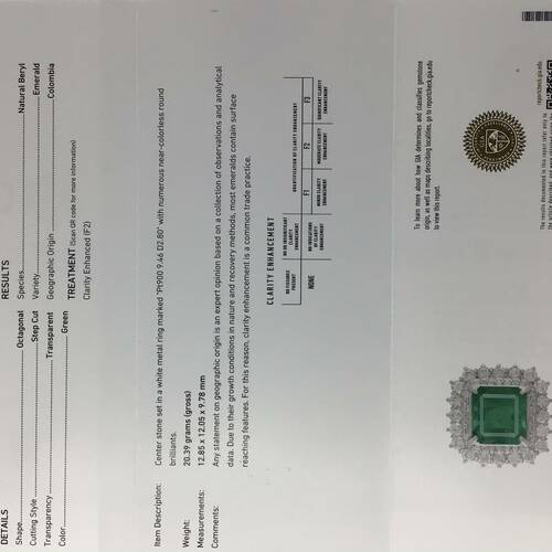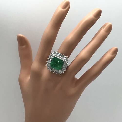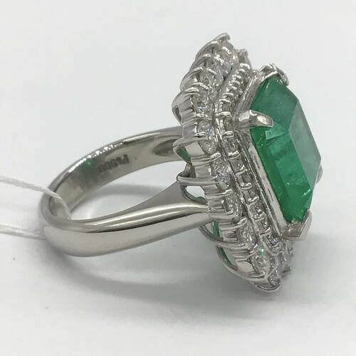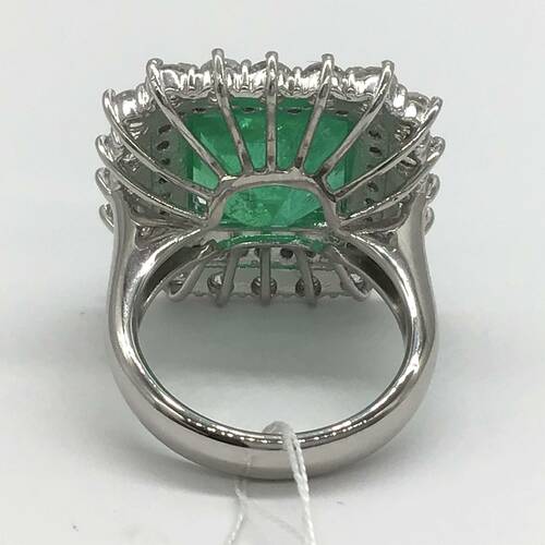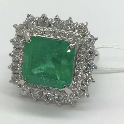 5月誕生石のエメラルドの中でもコロンビア産は混じり気のない最も純粋で美しいエメラルドとされています。更に9.46キャラットの大きさと回りの2.28キャラットのダイヤモンドの輝きがとても豪華で美しいリングです。 鑑別書付き。