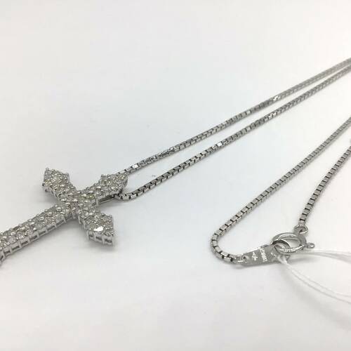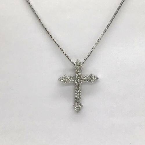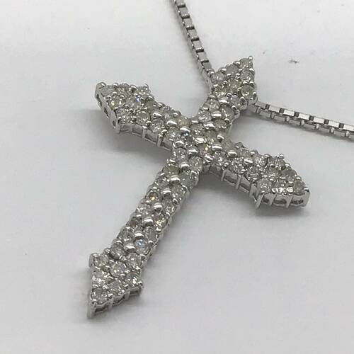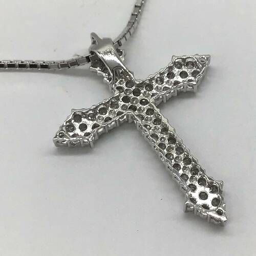 定番人気のクロスのネックレスです。全体にダイヤモンドが敷き詰められ、輝きが豪華です。