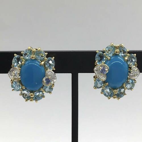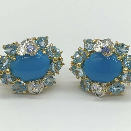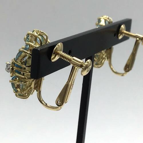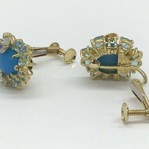 | コメント | 12月誕生石のトルコイシ(ターコイズ)の鮮やかなブルーとブルートパーズの濃淡の色がおしゃれで、可愛らしいデザインのイヤリングです。 |