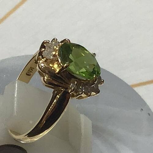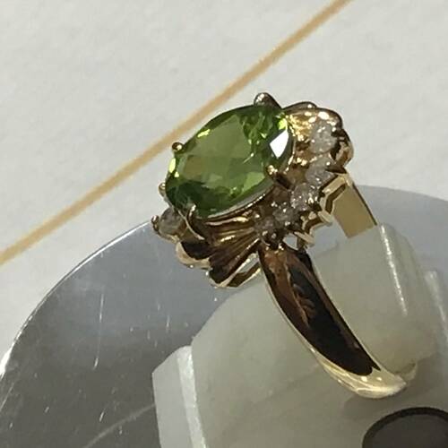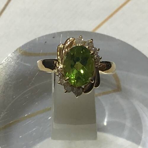 コメント ベリドットを取り巻くダイヤと地金の細工がとても素敵な逸品。
