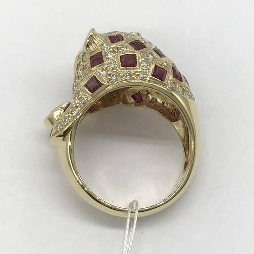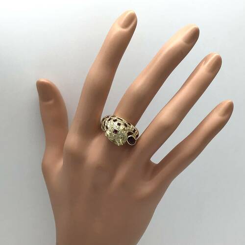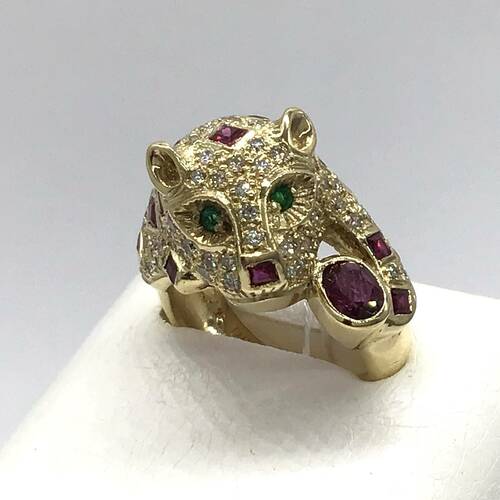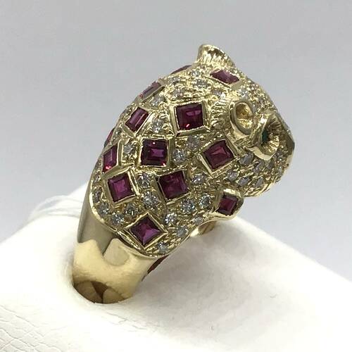 | コメント | 豹がモチーフのリングです。豹柄にルビー、目にはエメラルド、体全体にダイヤモンドが敷き詰められた、豪華なリングです。 |
