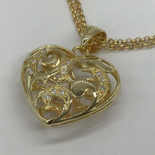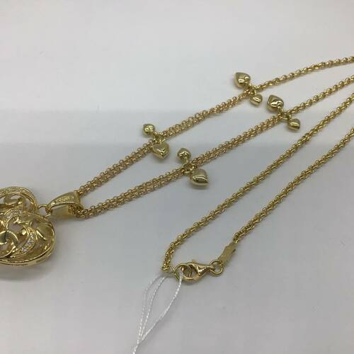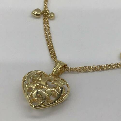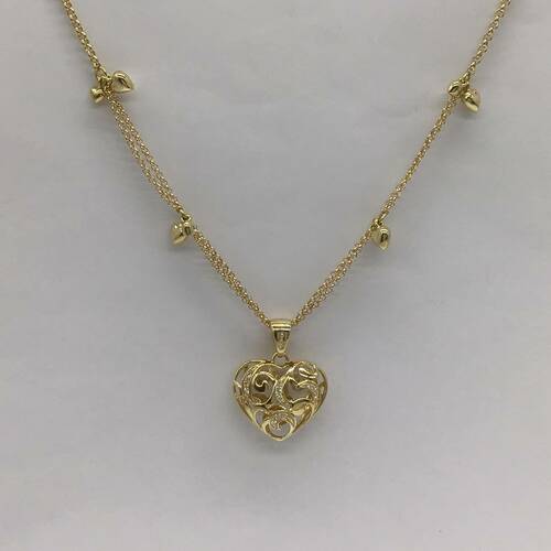 ぷっくりとしたフォルムのハートのネックレスです。両面透かしになり、片面にはダイヤモンドが施されています。2重チェーンで所々にハートのチャームが付いている可愛らしいデザインです。