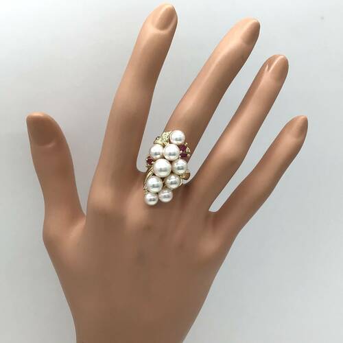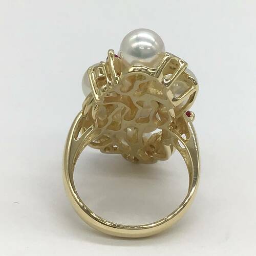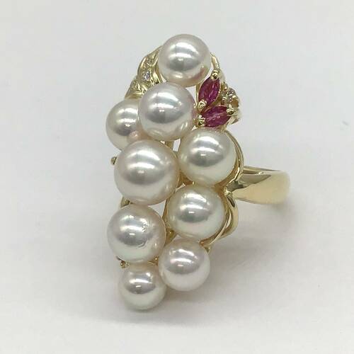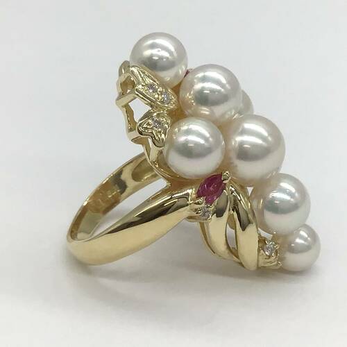 | コメント | 6月誕生石のパールの中でもアコヤは上品な光沢と色合いが美しく、最もオーソドックスな真珠です。9石の真珠にルビーの赤色がアクセントになった豪華なリングです。 |