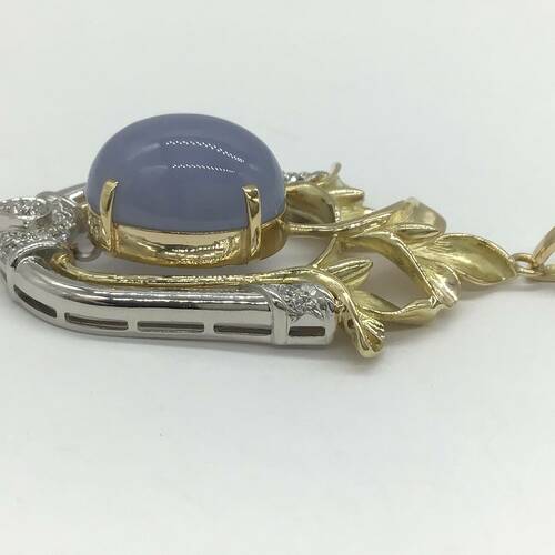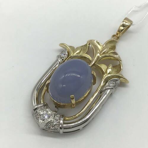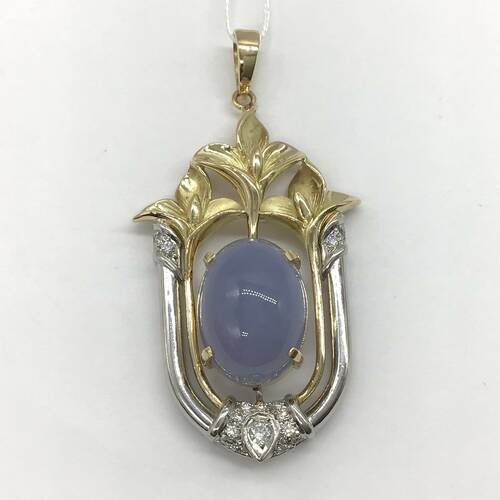 中世のヨーロッパを思わせる美しい彫りの枠の中にカルセドニーが施された豪華なペンダントトップです。カルセドニーは微細な石英の結晶が塊状に集まった半透明の天然石です。