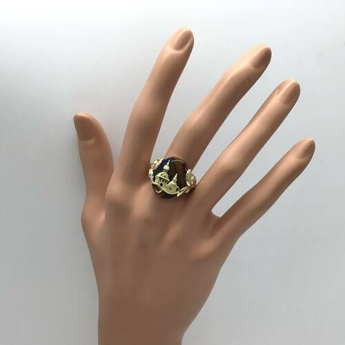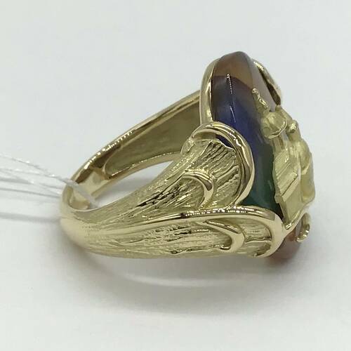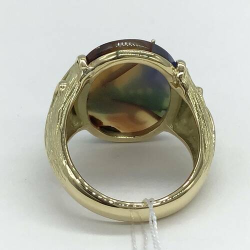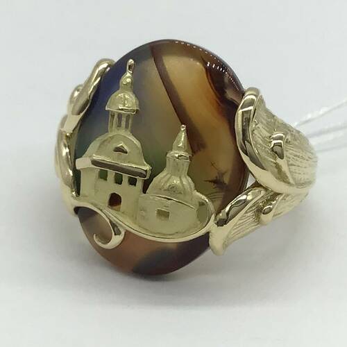 様々な色が混ざり合ったメノーに西洋の建物が施された、おしゃれなリングです。