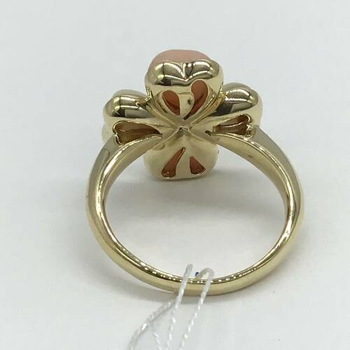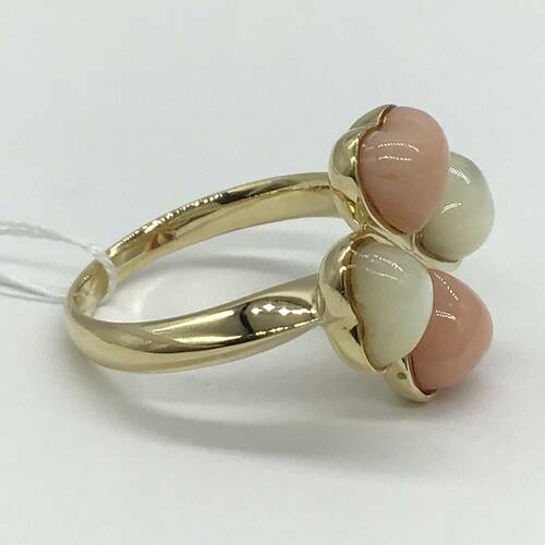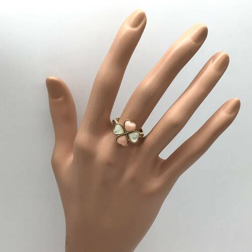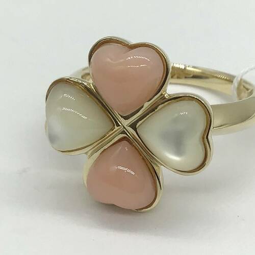 淡いコーラルのサンゴと乳白色のシェルの四葉のクローバー🍀が可愛らしいリングです。
