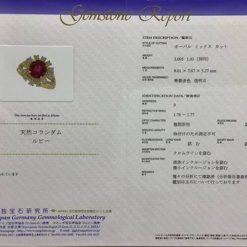 | コメント | 7月誕生石のルビー中でも世界最高品質と言われるミャンマー産の3.095キャラットのルビーです。1.03キャラットのダイヤモンドの輝きが素晴らしい豪華なリングです。鑑別書付き。 |