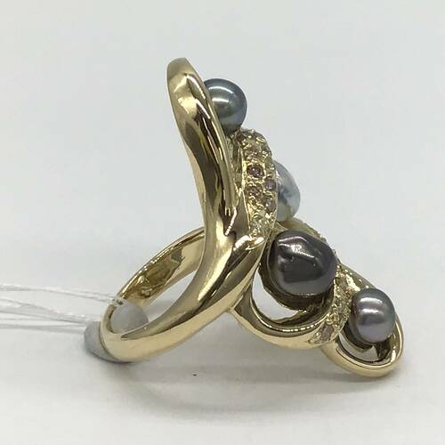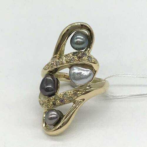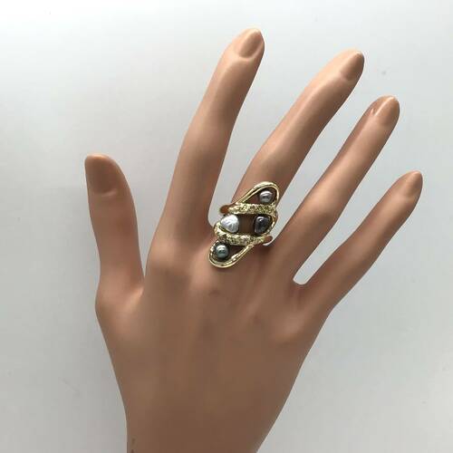 6月誕生石のパールが様々な色合いと形が個性的で存在感のあるデザインのリングです。