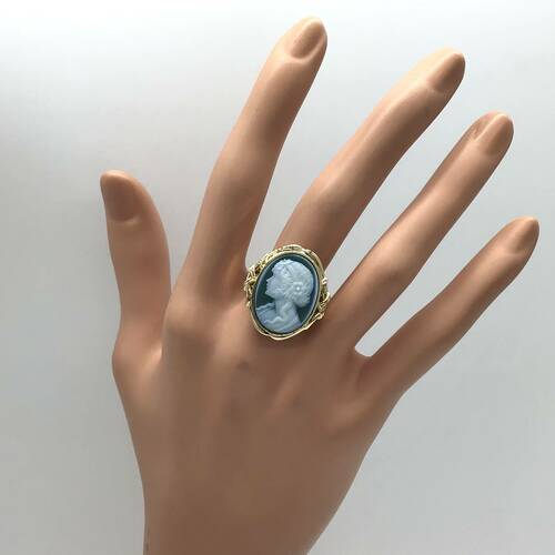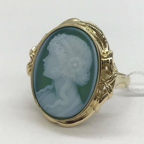 縞メノーに彫刻されたストーンカメオの一種です。宝石に凸型に浮き彫りされたものです。メノーの色コントラストを利用して彫刻されています。女性の横顔が繊細に彫られています。