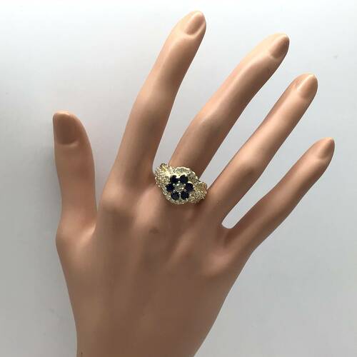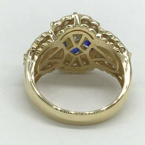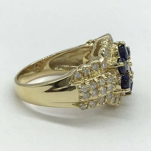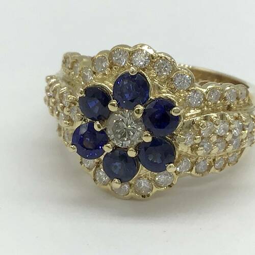 9月誕生石のサファイアが花びらの形をした可愛らしいデザインです。回りのダイヤモンドの輝きが豪華なリングです。