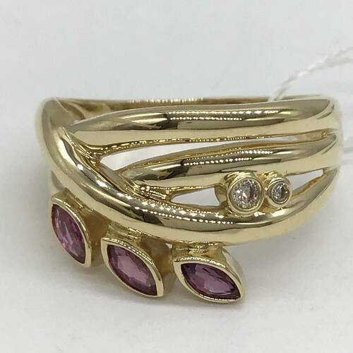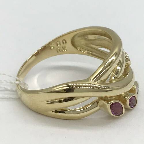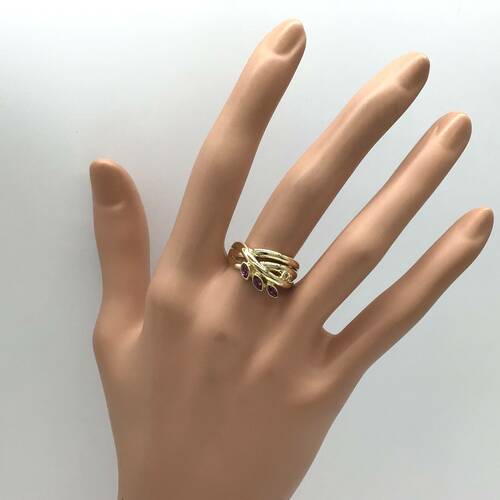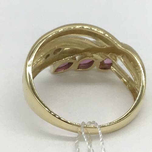7月誕生石のルビーが3石、葉のようなデザインが可愛いリングです。
