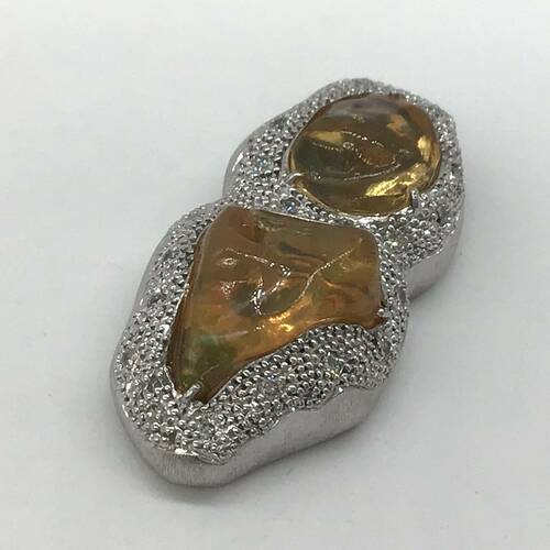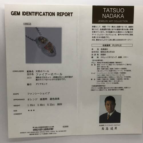 | コメント | 10月誕生石のオパールは虹のような遊色効果が美しく、角度や光の当たり方で異なる表情を見せる幻想的な宝石です。その中でもファイアーオパールはオレンジや黄色の地色の鮮やかな色合いが美しいです。俳優名高達男のコレクションのペンダントトップです。鑑別書付き。 |