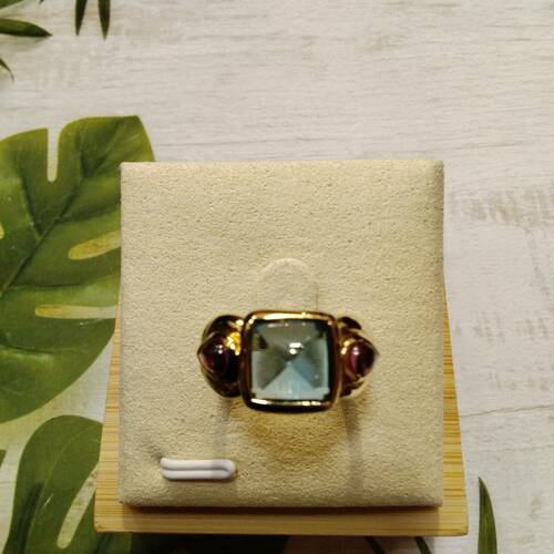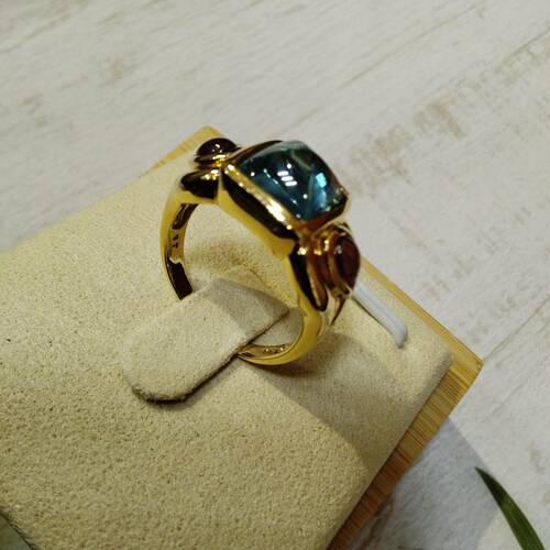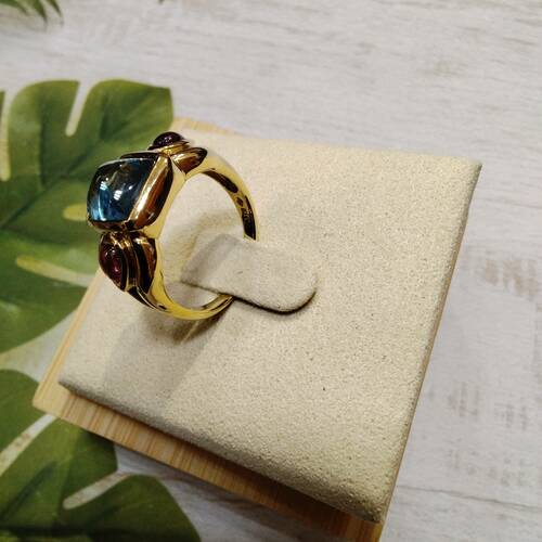 | コメント | 中央にブルートパーズ、脇にガーネットの付いたゴージャスなリングです。 |