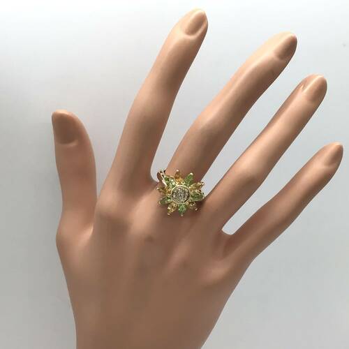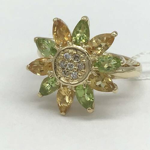 8月誕生石のペリドットと11月誕生石のシトリンがひまわりのような華やかなで可愛らしいリングです。