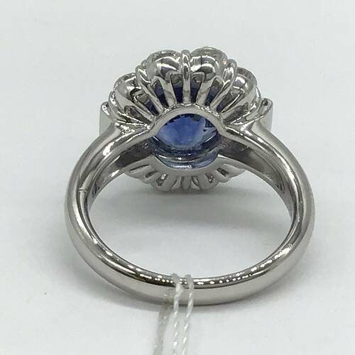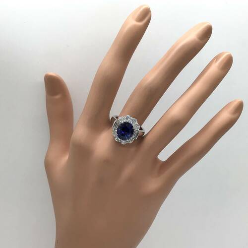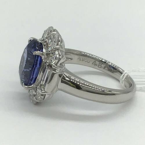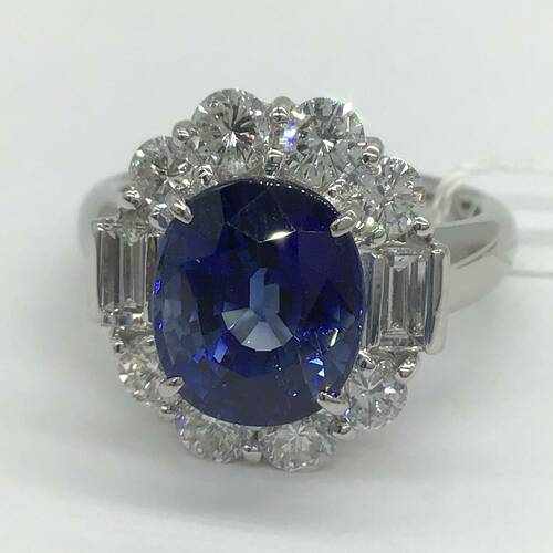 9月誕生石のサファイアが4.87キャラット、ダイヤモンドが1.60キャラットの輝きが豪華なリングです。