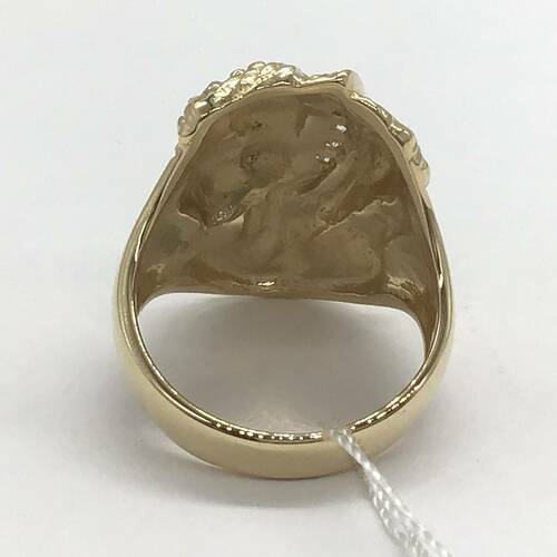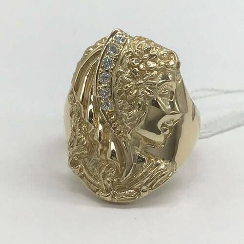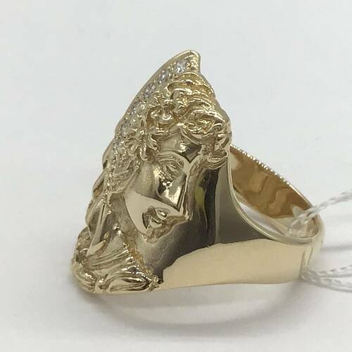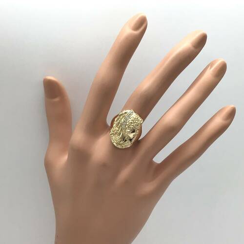 女性の横顔が彫られたおしゃれなリングです。女性が身につけているカチューシャにダイヤモンドが施されています。