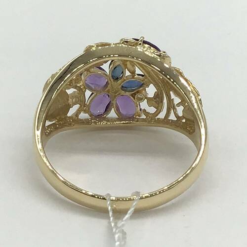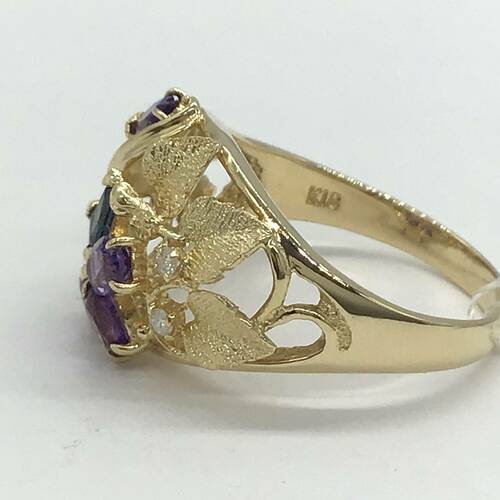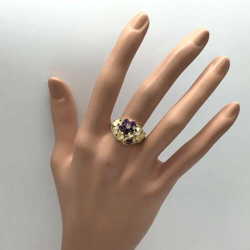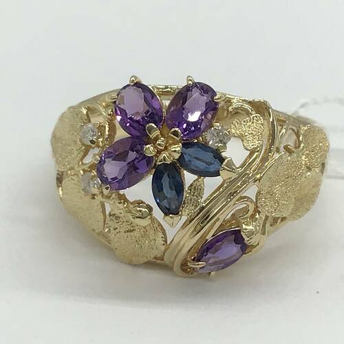 2月誕生石のアメジストとサファイアの花びら、ボタニカルな透かし彫りがおしゃれなリングです。