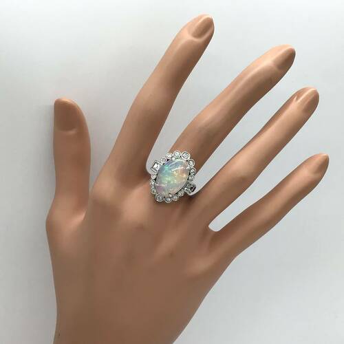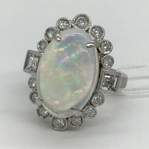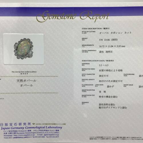 | コメント | 10月誕生石のオパールは虹のような遊色効果が美しく、角度や光の当たり方で異なる表情を見せる幻想的な宝石です。回りの1.06キャラットのダイヤモンドの輝きが豪華なリングです。鑑別書付き。 |