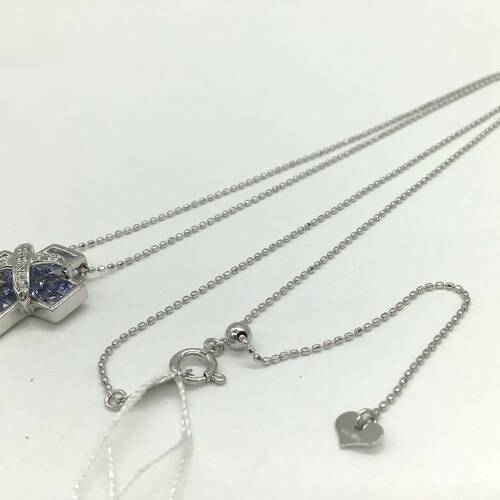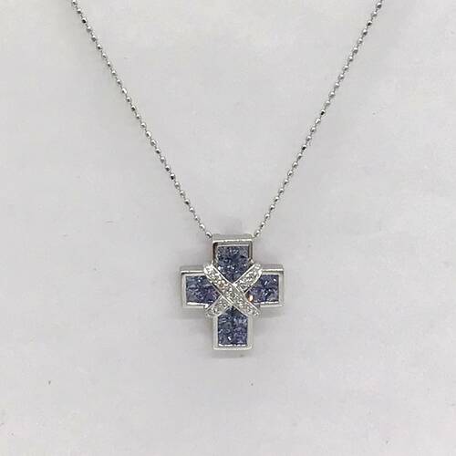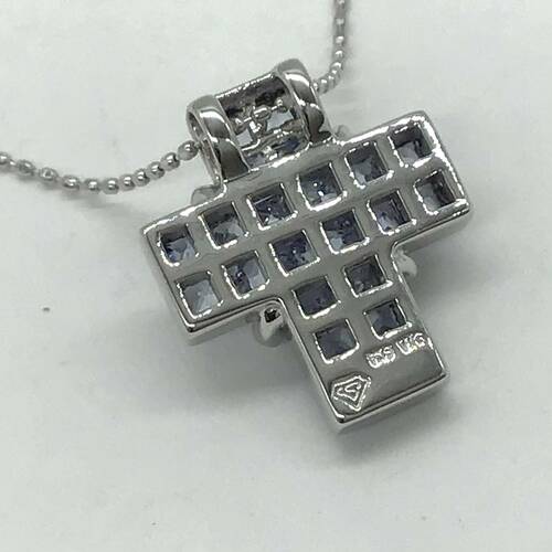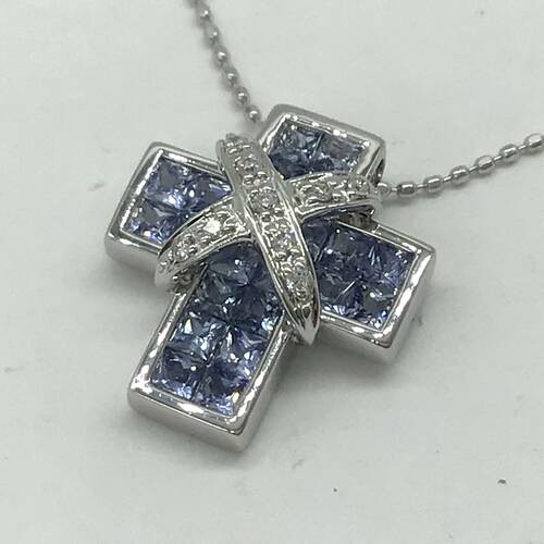 9月誕生石のサファイアのクロスのおしゃれなネックレスです。スライドアジャスターにより長さ調整が可能。