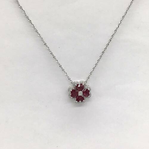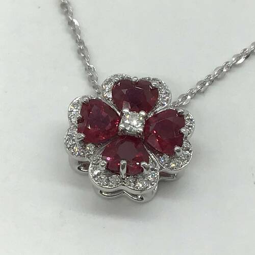 7月誕生石のルビーの花びらが可愛らしいネックレスです。スライドアジャスターにより長さ調整が可能。