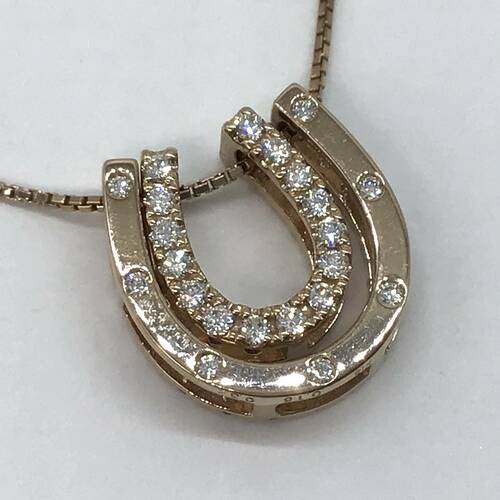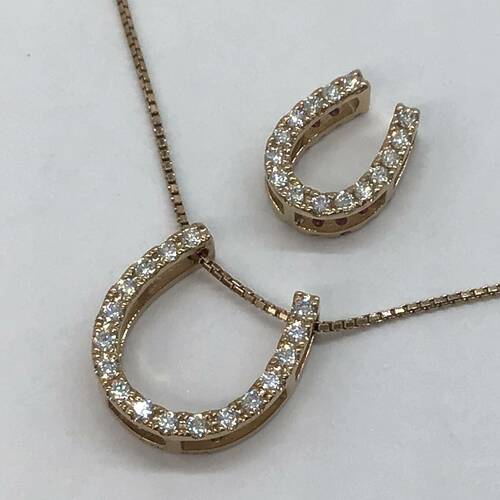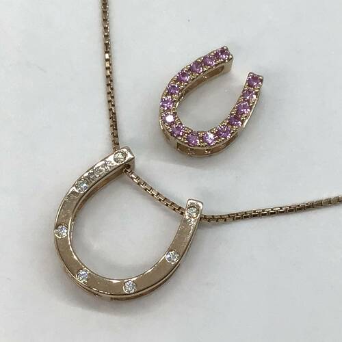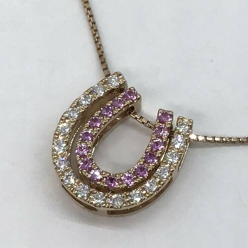| コメント | 2つの馬蹄型が変えられ、ダイヤモンドとピンクサファイアの両面が使えます。また取り外しができるため単体でも可愛らしいネックレスです。組み合わせは8通りできます。 |