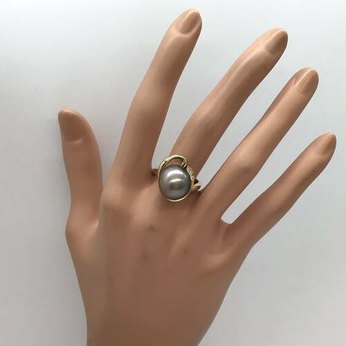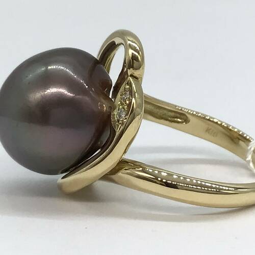 6月誕生石のパールの中でもクロチョウは黒蝶貝という天然の二枚貝から産出されます。存在感のある大きさと色がとても美しいリングです。