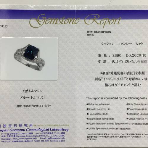 10月誕生石のトルマリン中でもインディコライトは希少性が高く、独創的な濃い青色が特徴です。鑑別書付き。