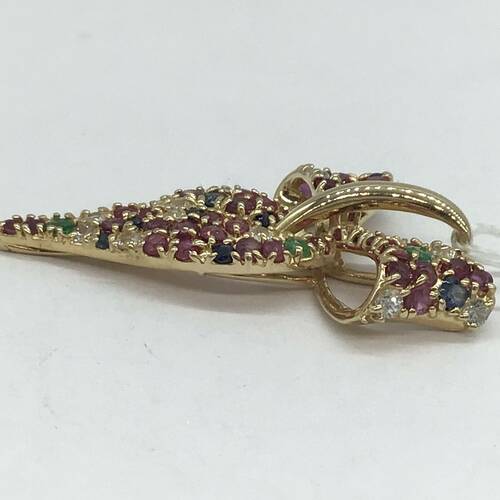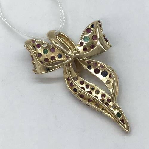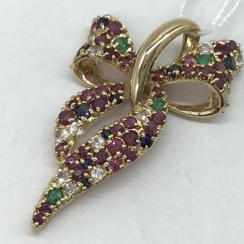 色とりどりの宝石が散りばめられたリボンモチーフの可愛らしいペンダントトップです。