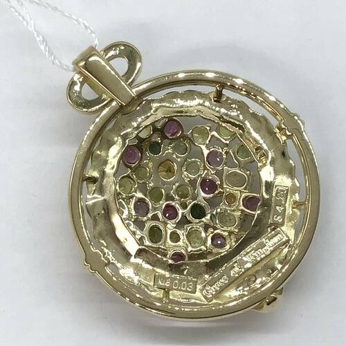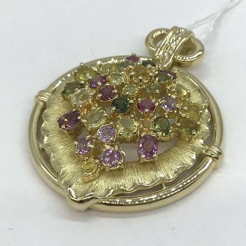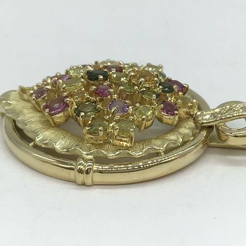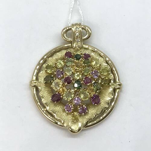 9月誕生石のサファイアはカラーバリエーションが豊富です。色とりどりのサファイアが施された豪華なペンダントトップです。