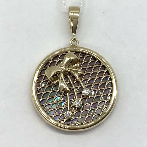 シェルのオーロラが透けて見えるおしゃれで、リボンのモチーフが可愛らしいペンダントトップです。