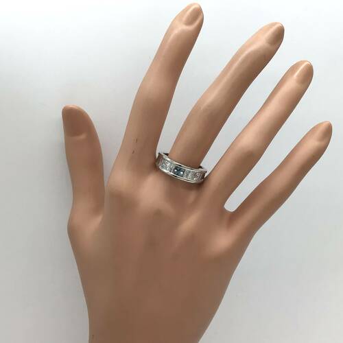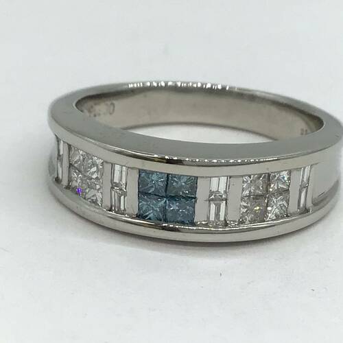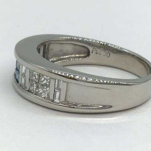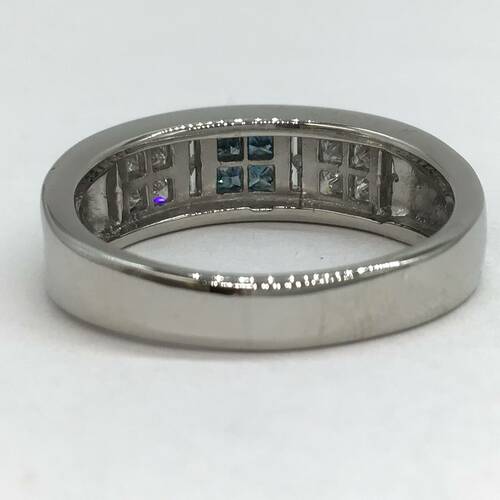 中心にブルーのダイヤモンドが施されたハーフエタニティリングです。