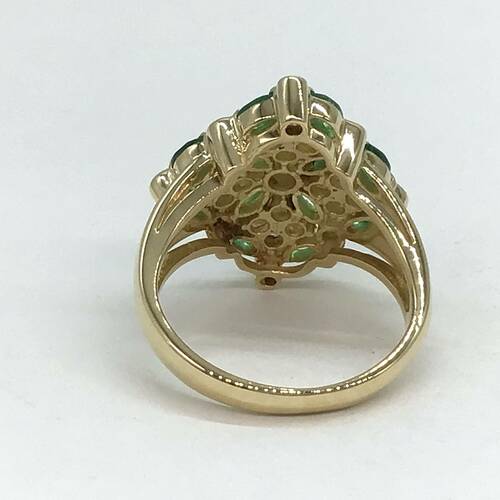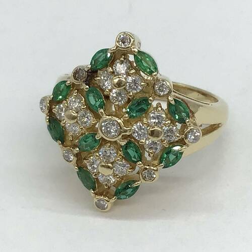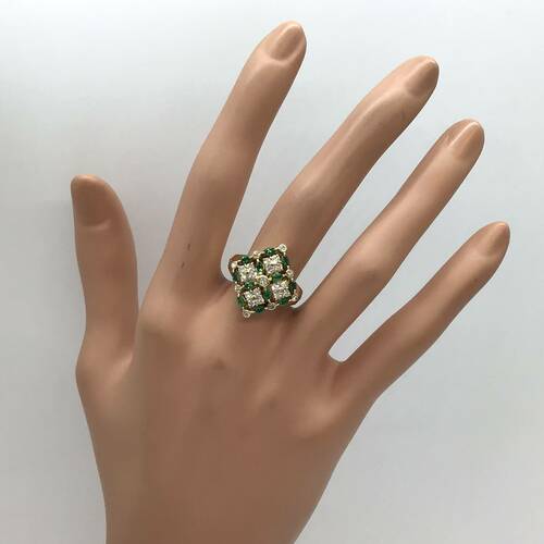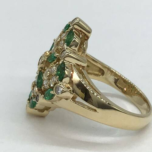 5月誕生石のエメラルドとダイヤモンドが華やかにデザインされたおしゃれなリングです。