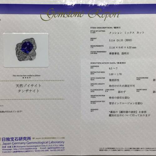| コメント | 12月誕生石のタンザナイトは深い青色の輝きが印象的な宝石です。多色性があり、角度を変えるたびに青や紫が強くなります。身に着ける人を守るパワーがあります。鑑別書付き。 |