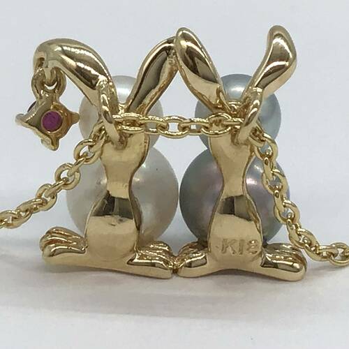 パールでできた2匹のうさぎの後ろ姿が可愛らしいネックレスです。