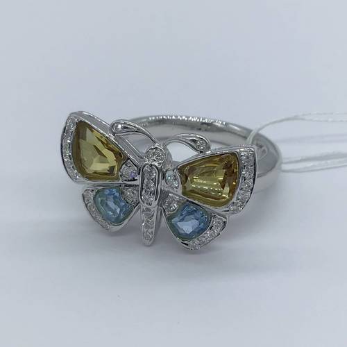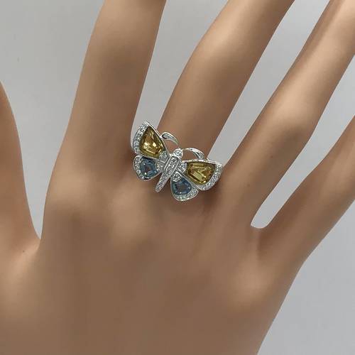 | コメント | 蝶を型どったリングですが、今にも飛び立とうとする羽の部分にはシトリンとブルートパーズで出来ています。 縁取りにはダイヤモンドが施され、可愛いだけではなく、豪華なリングです。 |