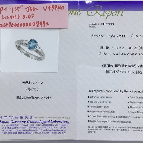 | コメント | パライバカラーのトルマリン。成分分析の結果、銅が含有されていないため、トルマリンの名称になりますが、この色をお探しの方にはお勧めの商品です。鑑別書付き。 |