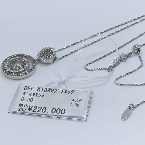 | コメント | 3重の輪の部分とバチカンも2重の輪になり、それぞれダイヤモンドが施されています。 胸元で揺れる時輝きが増します。スライドアジャスターにより長さ調整可能。 |
